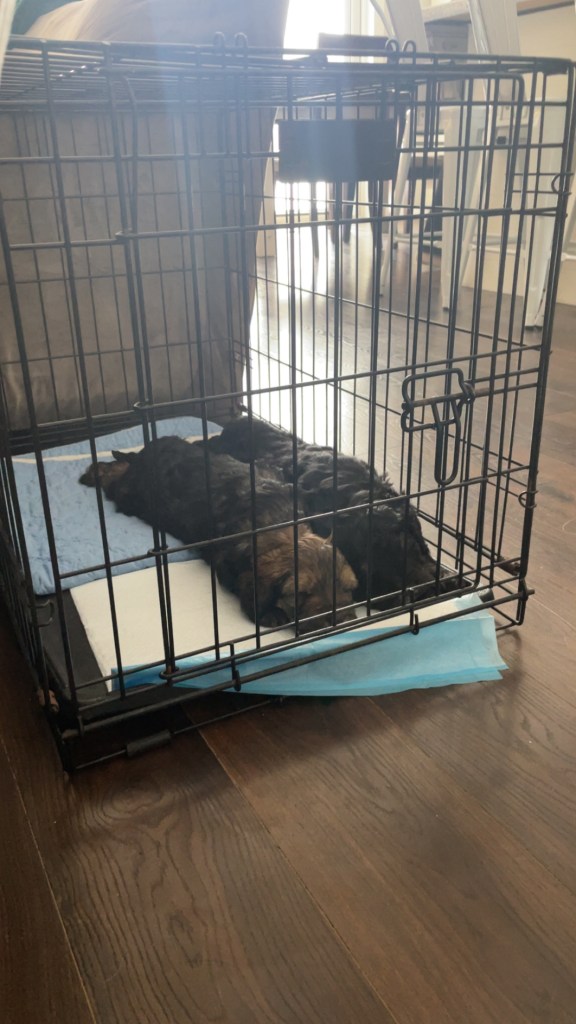 Crate training starts around 4 weeks of age. Teaching calm, happy crate manners while they’re young sets everyone up for success. While a crate is never a place for a dog to spend their life, it can become a safe den for sleeping, short absences, travel, or simply a quiet break. It also makes potty-training so much easier!
