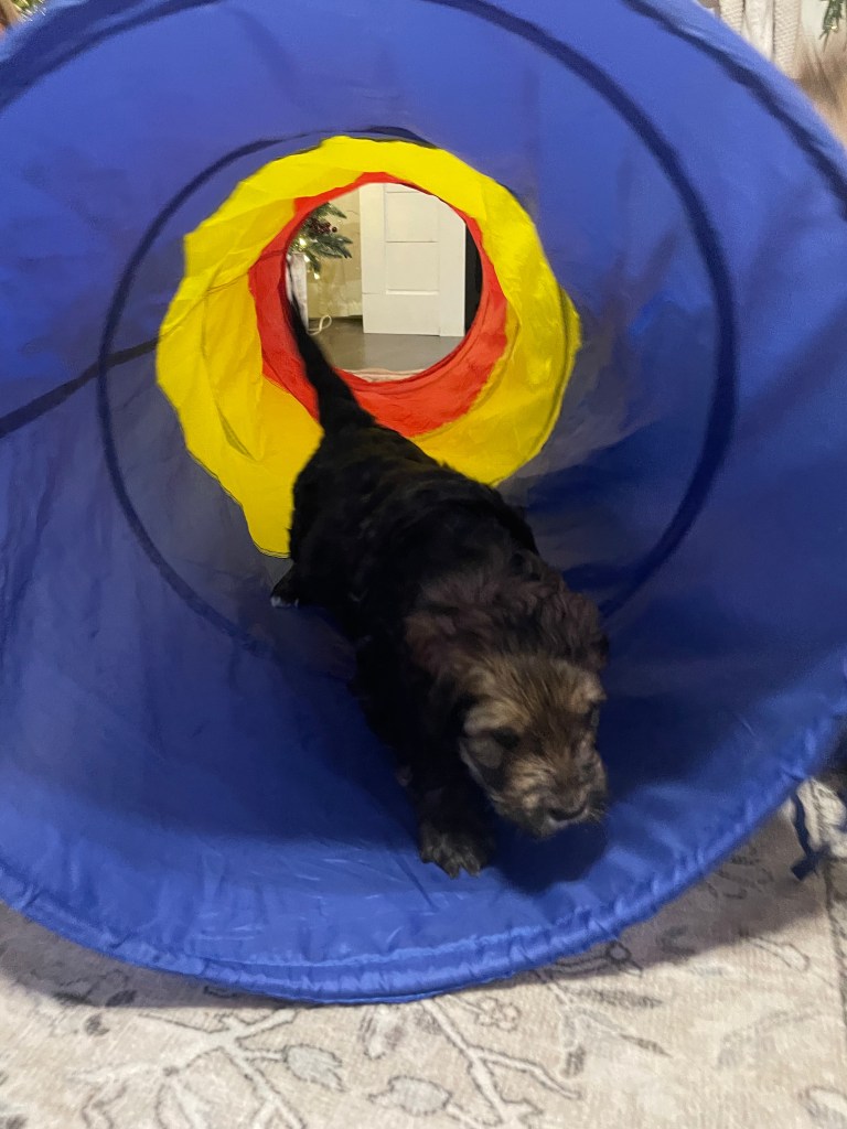 We begin early potty-training habits as soon as the puppies are 3 weeks old. It starts small in the whelping box and, by the time they go home, we are already developing outdoor potty habits. They quickly learn there’s a “right place” to go, and teaching them early is a great benefit for their forever family.